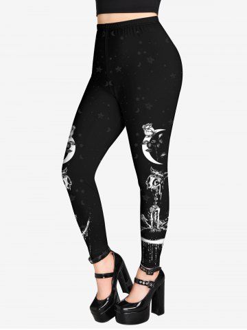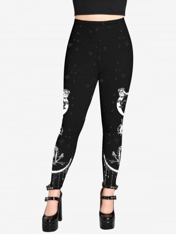 Legging D'Halloween Moulant Gothique Rose Crâne et Lune Imprimées - Noir - Noir