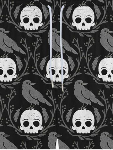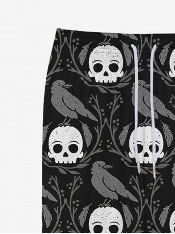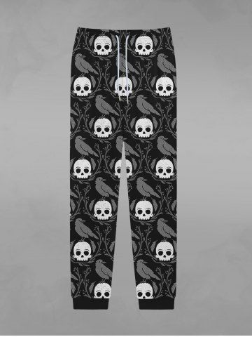 Pantalon de Survêtement avec Cordon de Serrage à Imprimé Crâne Fleurs et Oiseau Style Gothique pour Hommes - Noir - Noir