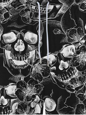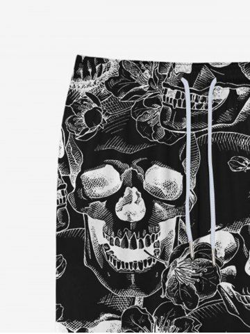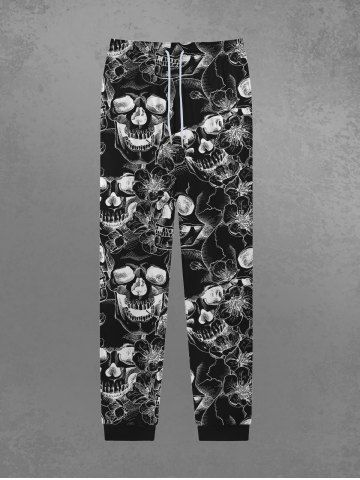 Pantalon de Survêtement avec Cordon de Serrage à Imprimé Crânes et Fleurs Style Gothique pour Hommes - Noir - Noir