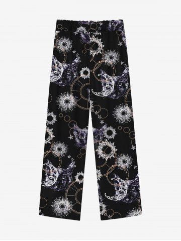 Pantalon de Survêtement Jogging Gothique Chat Lune et Ciel Etoilé Imprimés à Cordon - Noir - Noir