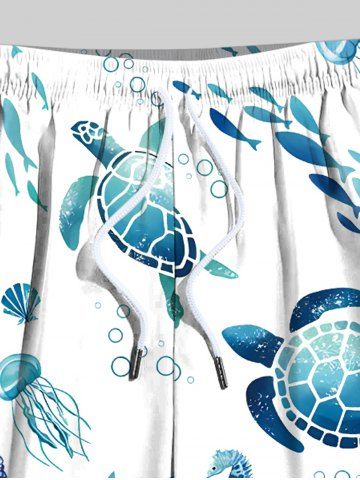 Short de plage grande taille à cordon de serrage pour homme, imprimé méduses, algues, hippocampe, tortue, poisson, créatures marines hawaïennes - Blanc - Blanc