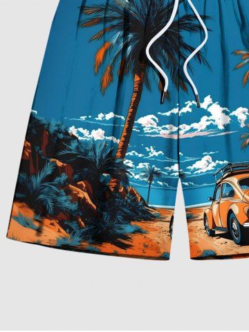 Short de Plage Hawaïen à Imprimé Cocotiers et Paysage Marin Grande-Taille pour Hommes - Bleu Ciel - Bleu Ciel