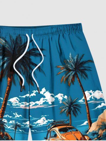 Short de Plage Hawaïen à Imprimé Cocotiers et Paysage Marin Grande-Taille pour Hommes - Bleu Ciel - Bleu Ciel