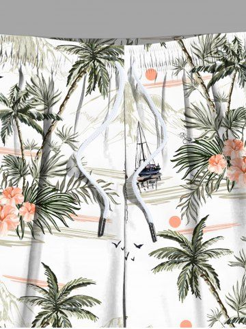 Short de plage hawaïen grande taille à imprimé cocotiers, fleurs d'hibiscus, soleil et montagne pour homme - Blanc - Blanc