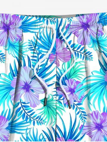 Short de plage hawaïen grande taille à imprimé feuilles tropicales et fleurs d'hibiscus pour homme - Bleu Clair - Bleu Clair