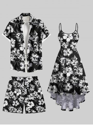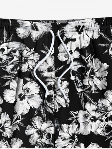 Short de plage hawaïen grande taille à imprimé fleurs d'hibiscus et crânes pour homme - Noir - Noir