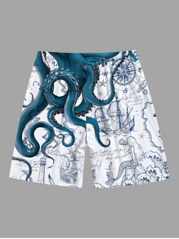 Short de plage hawaïen grande taille pour homme, imprimé sirène, gouvernail de bateau, pieuvre, croisière - Blanc - Blanc