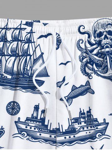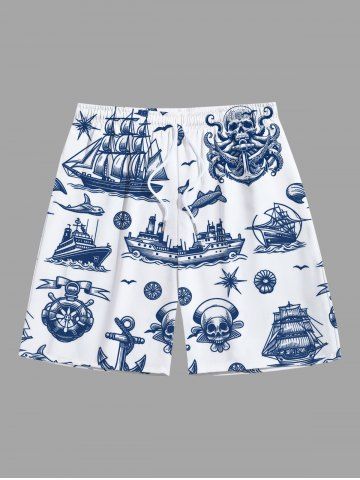 Short de plage hawaïen grande taille pour homme, imprimé tête de mort, pirate, pieuvre, ancre, croisière - Blanc - Blanc