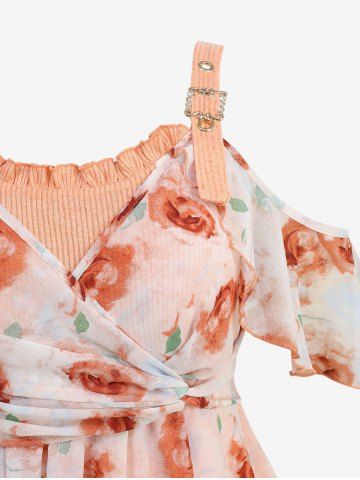 Blouses > Débardeur 2 en 1 grande taille à volants et imprimé de roses, ourlet tulipe fendu, épaules dénudées