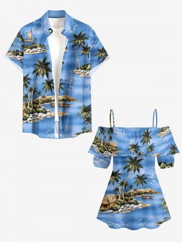 Blouse grande taille à imprimé cocotier, plage et hawaïenne, épaules dénudées et volants - Bleu Ciel - Bleu Ciel