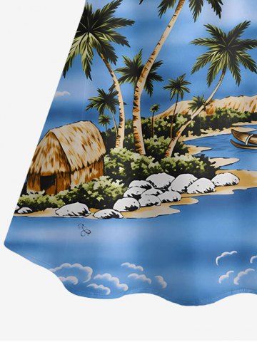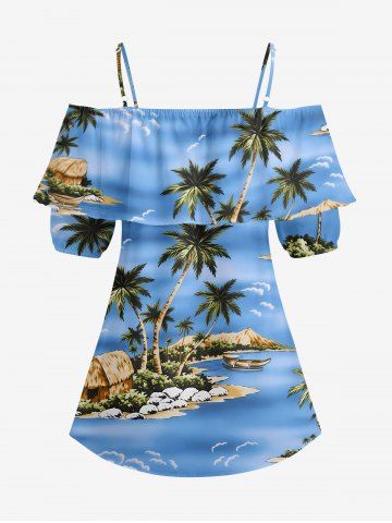 Blouse grande taille à imprimé cocotier, plage et hawaïenne, épaules dénudées et volants - Bleu Ciel - Bleu Ciel