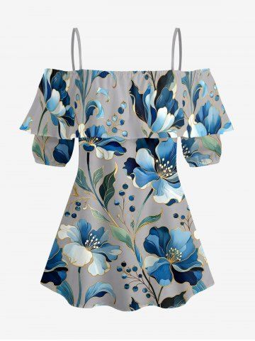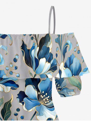 Blouse hawaïenne grande taille à imprimé floral et feuilles, épaules dénudées et volants, style hawaïen - Gris Foncé - Gris Foncé