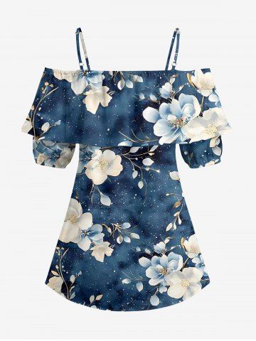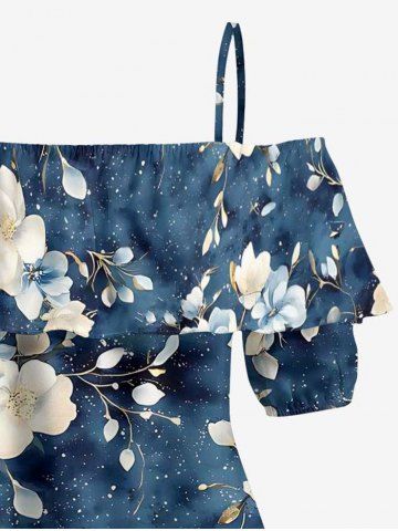 Plus Size Flower Leaf Branch Print Hawaii Cold Shoulder Ruffles Blouse - Bleu Profond - 2xl
