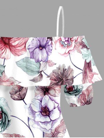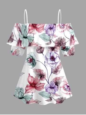Plus Size Flower Leaf Branch Print Hawaii Cold Shoulder Ruffles Blouse - Blanc - Blanc