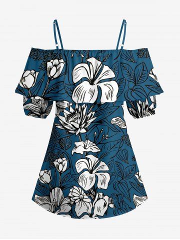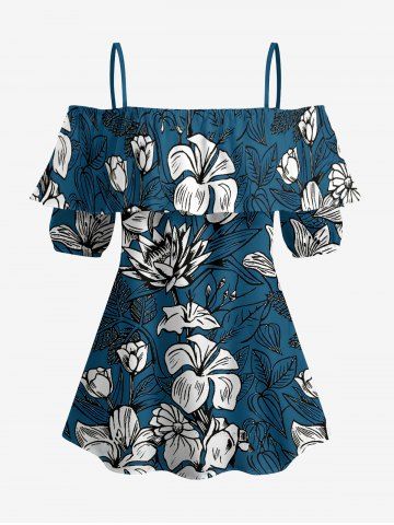 Plus Size Flowers Leaf Print Cold Shoulder Ruffles Cover Hawaii Blouse - Paon Bleu - S