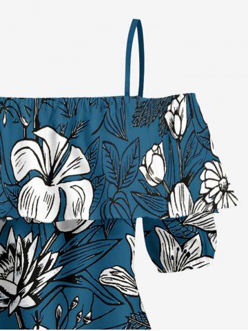 Plus Size Flowers Leaf Print Cold Shoulder Ruffles Cover Hawaii Blouse - Paon Bleu - Xl