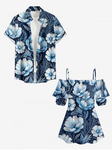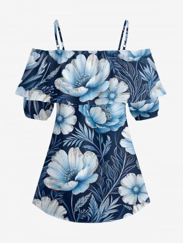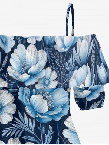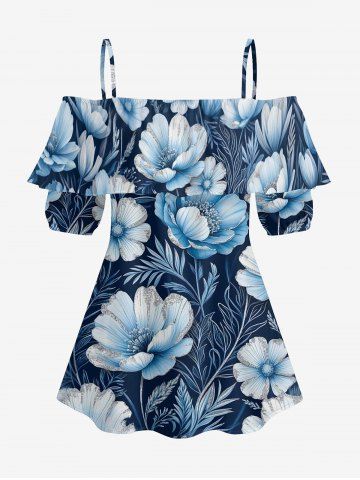 Plus Size Flowers Leaf Print Cold Shoulder Ruffles Cover Hawaii Blouse - Bleu Profond - L