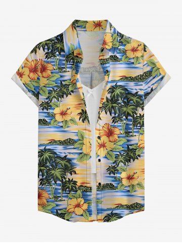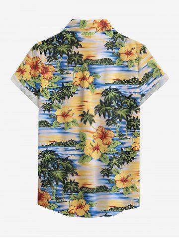 Hibiscus Flowers Leaf Coconut Tree Print Buttons Pocket Women Hawaii Shirt - Jaune - Jaune