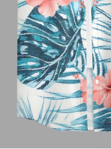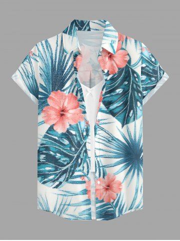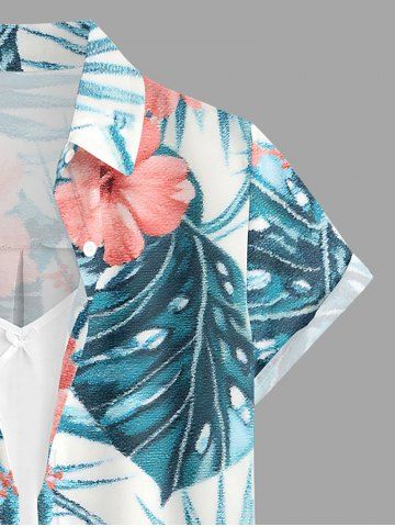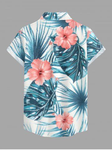 Hibiscus Flowers Tropical Leaf Print Buttons Pocket Women Hawaii Shirt - Bleu - Bleu