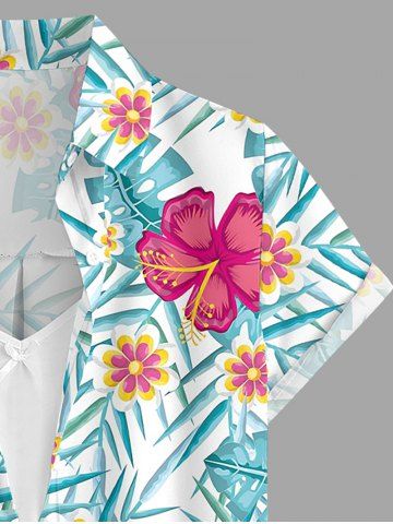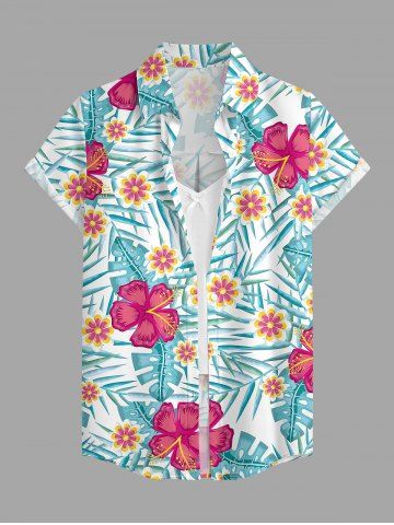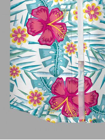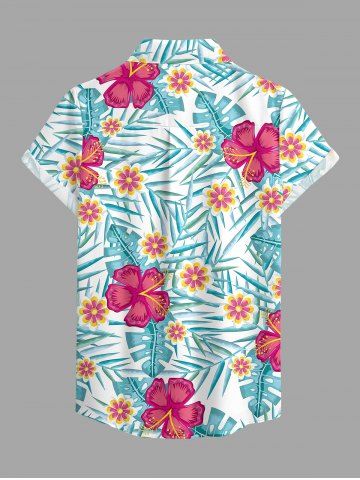 Hibiscus Flowers Tropical Leaf Print Buttons Pocket Women Hawaii Shirt - Bleu Clair - Bleu Clair