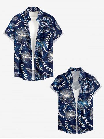 Women Flowers Leaf Print Buttons Pocket Hawaii Shirt - Bleu Profond - M
