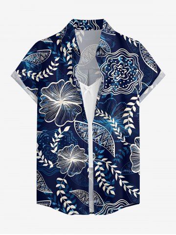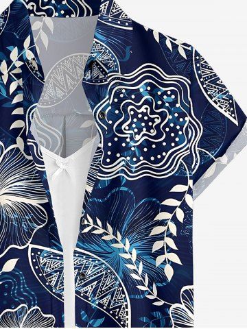 Women Flowers Leaf Print Buttons Pocket Hawaii Shirt - Bleu Profond - Xl