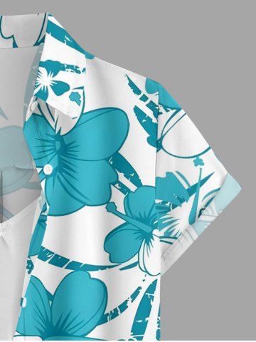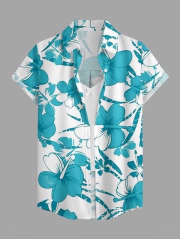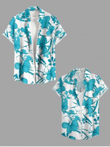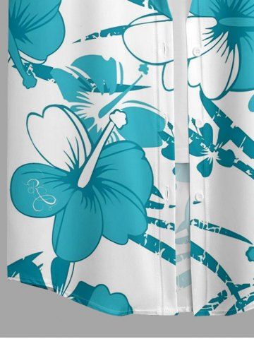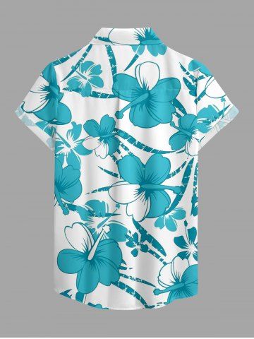 Women Hibiscus Flowers Tropical Leaf Print Buttons Pocket Hawaii Shirt - Turquoise - Turquoise