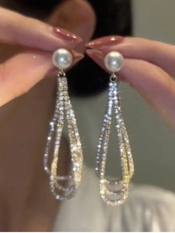 Boucles D'Oreilles Longues Ornées de Perles et Diamants Fantaisies avec Pompons - Argent - Argent