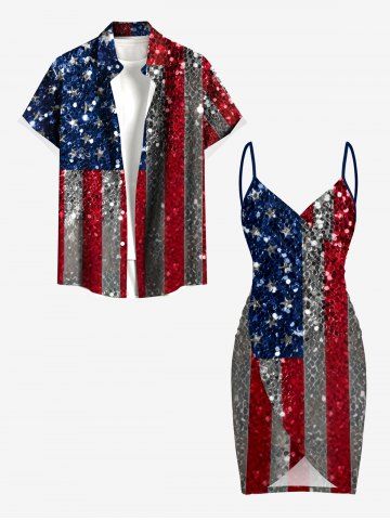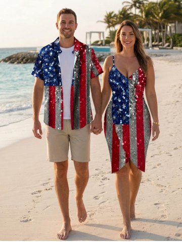 4th Of July Outfits> Glitter Sequins Patriotic American Flag Print Plus Size Matching Outfit For Couples