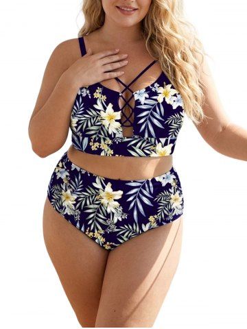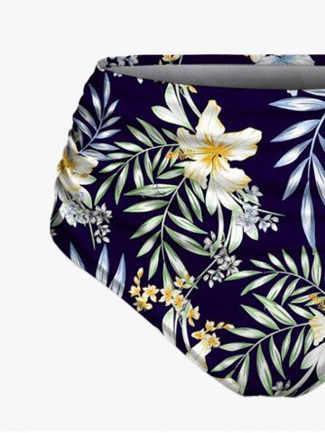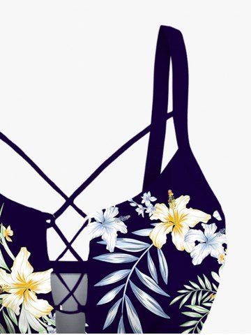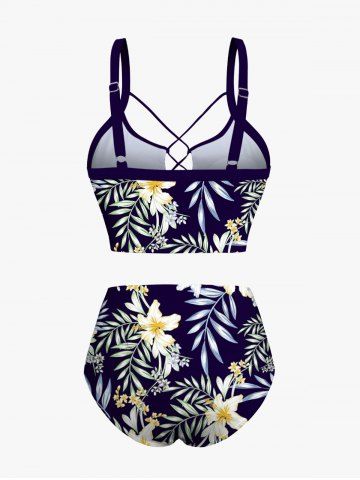 Maillot de bain tankini hawaïen à lacets, imprimé floral, branches et feuilles tropicales (bretelles réglables) - Bleu Profond - 1x