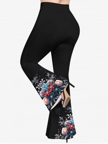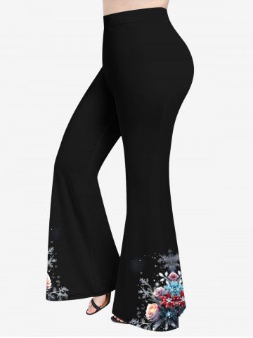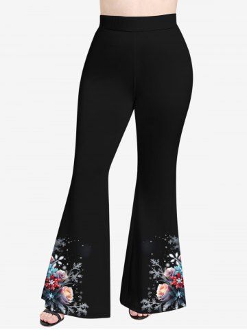 Pantalon Évasé à Imprimé Roses et Flocons de Neige de Noël Grande-Taille - Noir - Noir