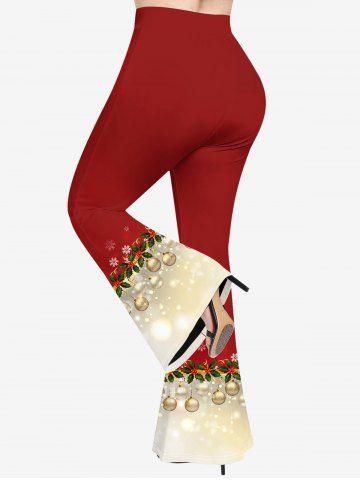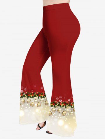 Pantalon Evasé Boule de Noël Feuille Imprimée en Blocs de Couleurs de Grande Taille à Paillettes - Rouge - Rouge