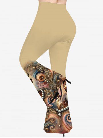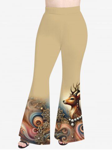 Pantalon évasé grande taille à imprimé de fleurs et de vagues, motif élans de Noël - Abricot - Abricot