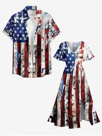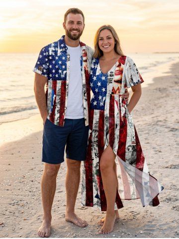 4th Of July Outfits> Patriotic American Flag Newspaper Print Plus Size Matching Outfit For Couples