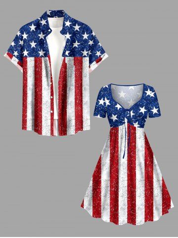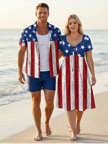 Patriotic American Flag Sparkling Sequin 3D Print Plus Size Matching Outfit For Couples - Rouge - Rouge