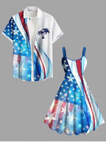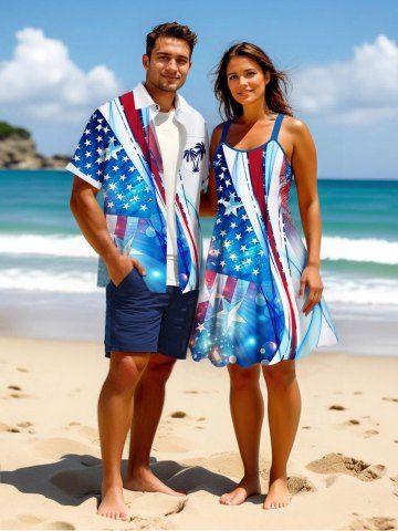 4th Of July Outfits> Tenue de plage hawaïenne assortie grande taille, motif drapeau américain patriotique, faisceau lumineux, imprimé 3D, pour couples