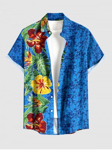 Chemise à Manches Courts > Chemise à boutons et poches pour homme, grande taille, imprimé floral tropical (feuilles et hibiscus), style hawaïen.