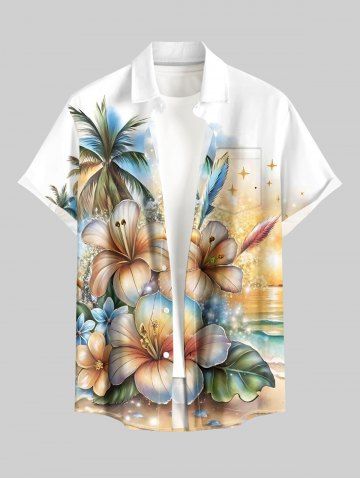 Chemise à Manches Courts> Chemise à boutons grande taille pour homme, imprimé hawaïen, feuilles tropicales pailletées, cocotiers et fleurs d'hibiscus, motif floral et fleurs de mer, avec motif cocotier et paillettes.