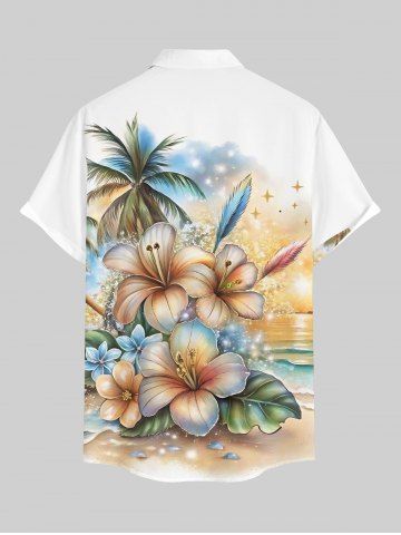 Chemise à Manches Courts> Chemise à boutons grande taille pour homme, imprimé hawaïen, feuilles tropicales pailletées, cocotiers et fleurs d'hibiscus, motif floral et fleurs de mer, avec motif cocotier et paillettes.