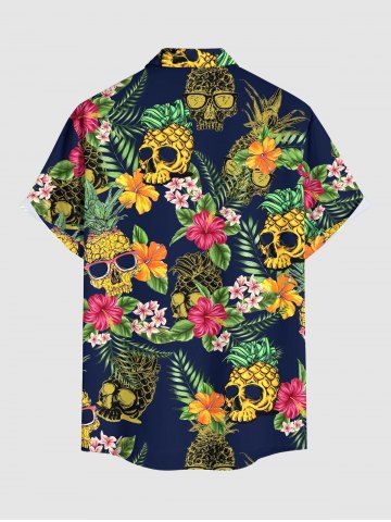 Chemise à boutons grande taille pour homme, imprimée de têtes de mort, d'ananas, de feuilles tropicales et d'hibiscus, style hawaïen. Motifs : crâne, ananas, feuilles tropicales et fleurs d'hibiscus. - Cadetblue - 2xl
