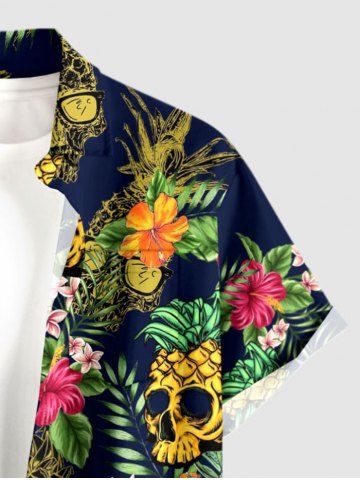 Chemise à boutons grande taille pour homme, imprimée de têtes de mort, d'ananas, de feuilles tropicales et d'hibiscus, style hawaïen. Motifs : crâne, ananas, feuilles tropicales et fleurs d'hibiscus. - Cadetblue - 4xl
