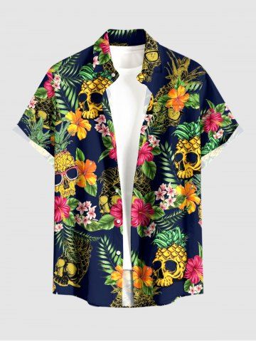Chemise à boutons grande taille pour homme, imprimée de têtes de mort, d'ananas, de feuilles tropicales et d'hibiscus, style hawaïen. Motifs : crâne, ananas, feuilles tropicales et fleurs d'hibiscus. - Cadetblue - 6xl