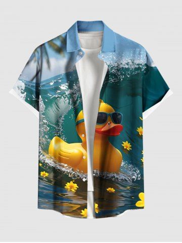 Chemise à Manches Courts> Chemise à poches boutonnées grande taille pour homme, imprimé canards et vagues, style hawaïen