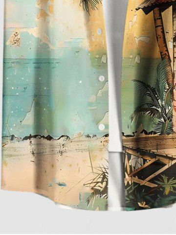 Chemise à Manches Courts> Chemise à poches boutonnées grande taille pour homme, imprimée cocotiers et maisons de mer, style hawaïen
