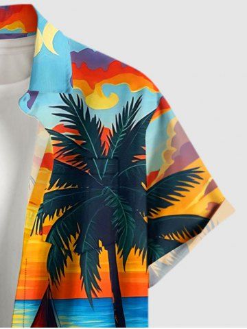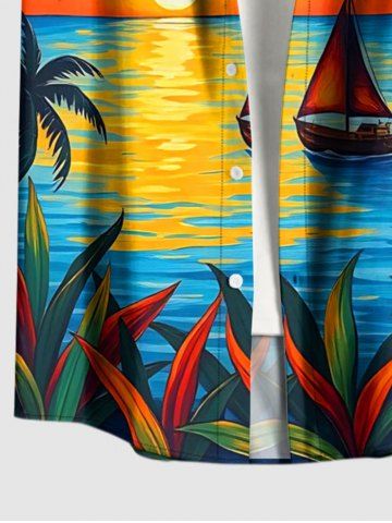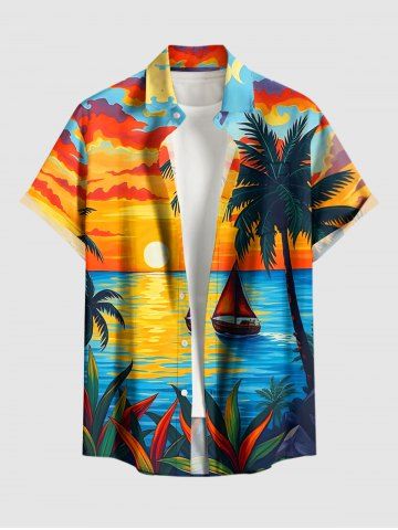 Chemise à Manches Courts > Chemise à poches boutonnées grande taille pour homme, imprimée d'un cocotier, d'un voilier et d'un crépuscule, style hawaïen.
