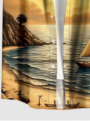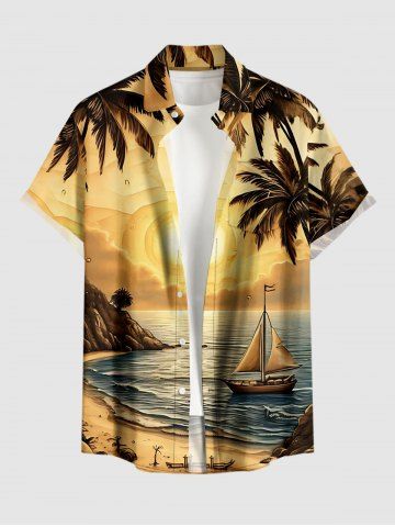 Chemise à Manches Courts> Chemise à poches boutonnées grande taille pour homme, imprimée de cocotiers, de voiliers et de soleil hawaïen.