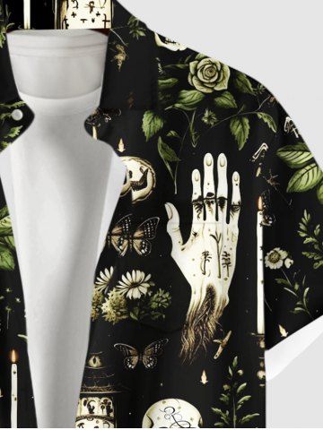 Chemise à Manches Courts > Chemise à poches boutonnées grande taille pour homme, imprimée de fleurs, de feuilles et de têtes de mort, style Halloween. Motif : main, crâne, bougie.