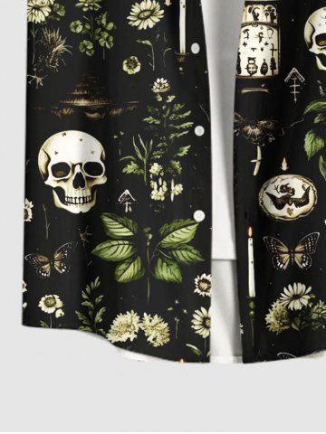 Chemise à poches boutonnées grande taille pour homme, imprimée de fleurs, de feuilles et de têtes de mort, style Halloween. Motif : main, crâne, bougie. - Noir - Noir