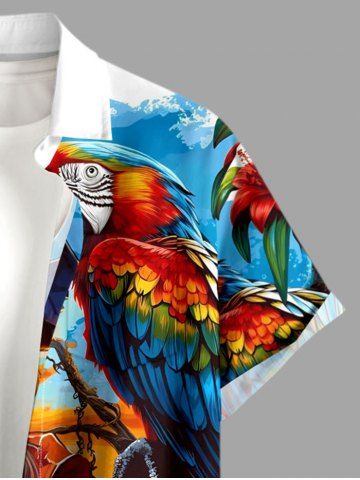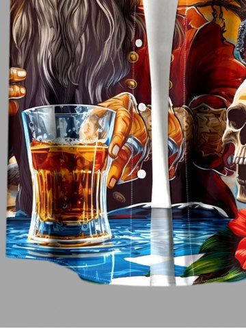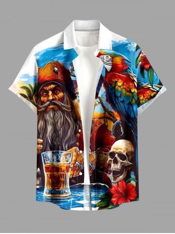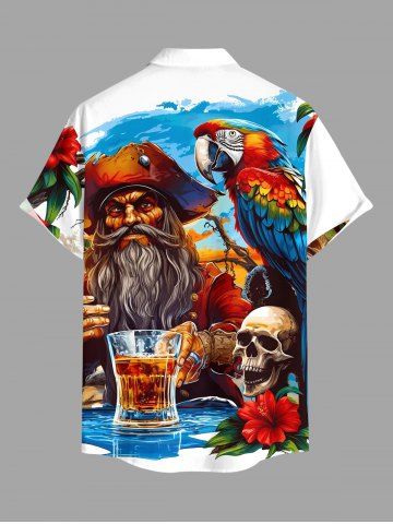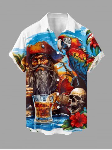 Chemise à Manches Courts> Chemise à poches boutonnées grande taille pour homme, imprimée tête de mort, hibiscus, perroquet et bière de pirate, style hawaïen