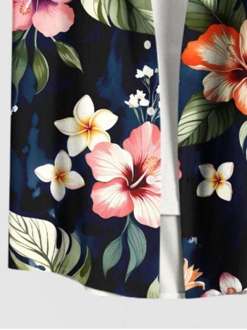 Chemise à Manches Courts> Chemise à poches boutons grande taille pour homme, imprimée de fleurs d'hibiscus et de feuilles tropicales, style hawaïen.